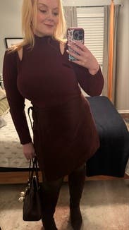 This definitely has a classy look while being comfortable and warm but make sure you have a good strapless bra because the cut outs land right where straps go.