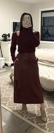 I wore with the leather wrap skirt and would size down to accommodate the volume on the bottom.