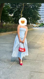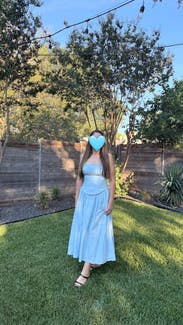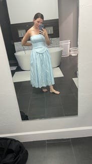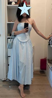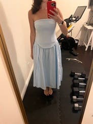 Love the color and the fit. Although it’s strapless, it stayed on me pretty well throughout the night. Hugs in the right places and perfect length for my height. I got stopped 3 times on the same night because someone was asking where I got the dress! The bottom part is more poplin/cotton so you have to steam it before you wear it. 10/10