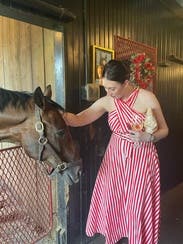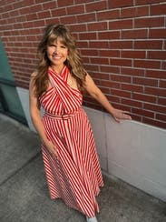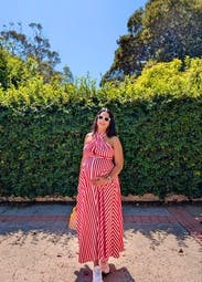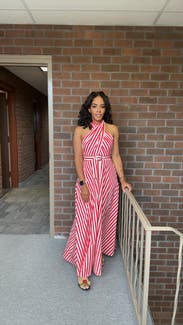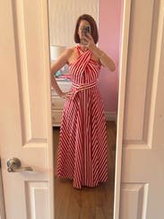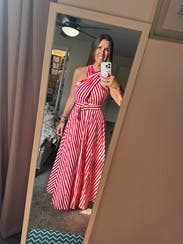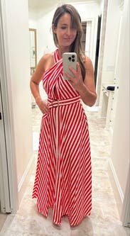 The halter neckline and belted waist flatter beautifully, while the flowy stripes add a fun, summery charm.