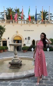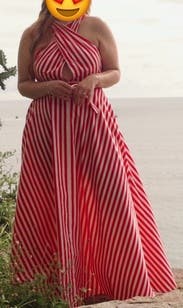 I wore this dress out for dinner on my honeymoon and felt it was a fun dress to wear!! It is a little complicated to put on and not the most comfortable so I purposely planned to wear it for the 1 night only. I wore it with sandals but it could be paired with heels too.