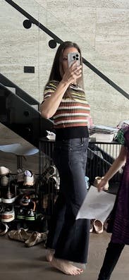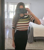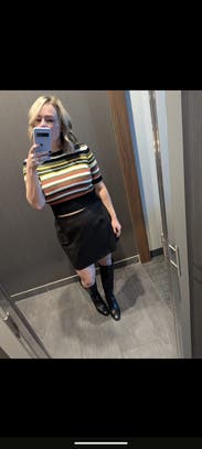 I absolutely love this stripe pattern, it felt retro and modern at the same time. Mine may have just been worn a bunch but it seems slightly stretched out or just a size too big. It’s super stretchy so I’d suggest sizing down one. It’s definitely cropped so for work I wore high waisted jeans so I would avoid a midriff situation. Would rent again!