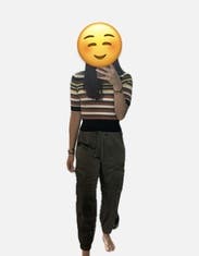 Wore with black high waisted slacks for work and with these jeans + sneakers for outside of work. Very cute and a flattering form fitting crop