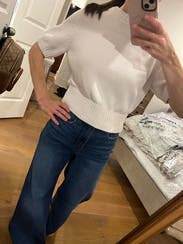 Toccin’s Elsie Cotton Pull‑On Sweater brings laid‑back elegance with its cropped shape and easygoing short sleeves—perfect when the sun’s up. Pair it with white linen trousers and slide‑on sandals for an effortlessly fresh spring or summer look.