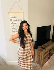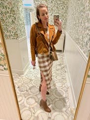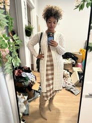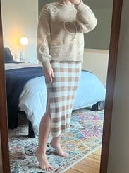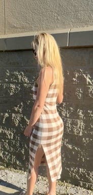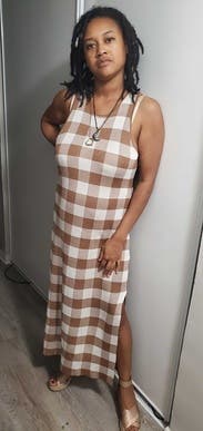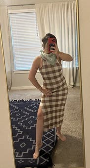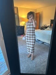 Adorable comfy midi dress with a leg split (my favorite), loved the color! Only down size was size, I was hoping for it to be more fitted on my waist (and overall), but it was loose and gave me an overall boxy shape. I’d recommend sizing down!
