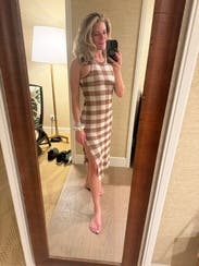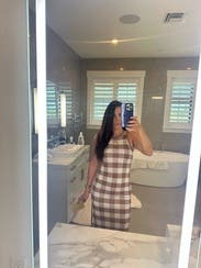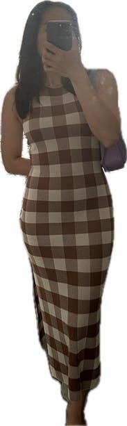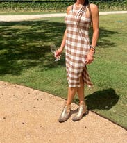 This Toccin dress features a classic brown and white gingham pattern, offering a timeless and chic vibe. Pair it with minimalist accessories and strappy sandals for an effortlessly elegant look.