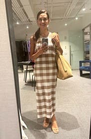 Super comfortable and doesn’t stretch out. Color is beautiful. Can definitely be dressed up with a black sandal or bootie and little leather jacket. Large check pattern camouflages where it hugs a bit in the midsection. Material is heavy but breathable. Cons: Clings a bit around the mid section.