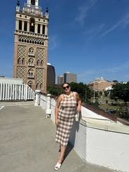 Love it- great pattern, great knit fabric, great fabric. Style with natural color shows and bag, gold bold jewelry and the dress really stands out. I like that the bottom has a little bit of a sweep so didn’t feel form fitting all of the way down, made it a bit more sophisticated.
