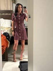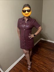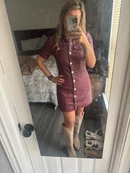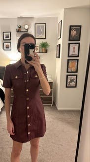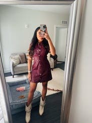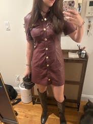 The fit was just right, hugging in all the right places while still allowing for movement and comfort. The faux leather material feels butter-soft, giving it a luxe look and feel, perfect for a party setting. The button-down front adds a touch of sophistication, and the short sleeves balance the fitted silhouette beautifully. I wore this to a casino-themed party, and it was a hit! The rich color and structured design made me feel both stylish and confident. I paired it with black heels and minimal accessories to let the dress shine. If you’re looking for something effortlessly chic with a luxurious feel, this is a must-have!