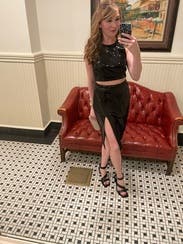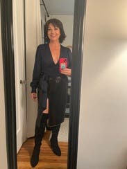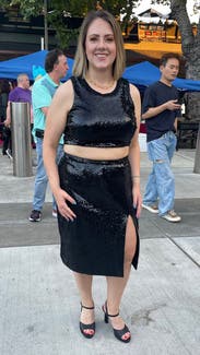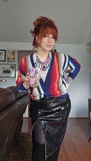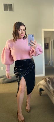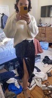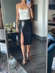 I wore this to cheers in my 45th year around the sun! I felt so gorgeous in this outfit and the skirt had just the right amount of sex appeal with that high slit that I almost bought this one! This was the perfect skirt to ring in my half-life! I wore a S, I could have worn an XS. Also, the sequins are not itchy and don’t “catch” of anything all night!