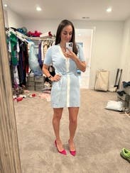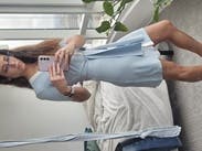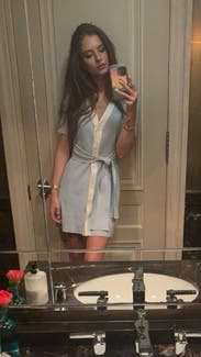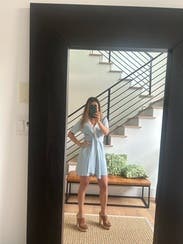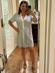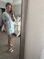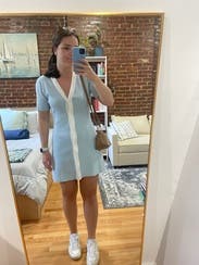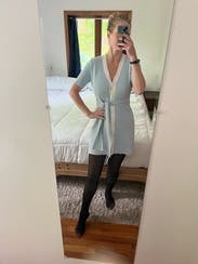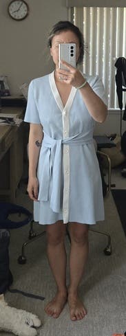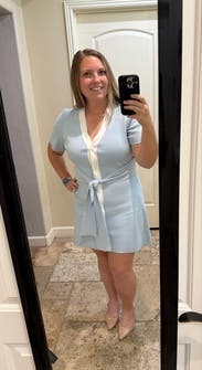 Loved this dress! The color and cut are stunning. So many compliments wearing this. Loved the tie detail! The knit material makes this extremely comfortable while still looking so polished. The fabric does crease and wrinkle easily, which I was a little surprised by with the knit, but the cut and gorgeous light blue made up for it. Great length- not too short!