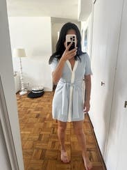 Loved this dress! The material is so soft and not too heavy. It does gap between the buttons a bit, so I wore a silk camisole underneath and tried to keep the front ties strategically placed on my lap when I sat down. A little short for work, but wore with flats and got tons of compliments. Wore a medium, and it was a bit loose, but still flattering.