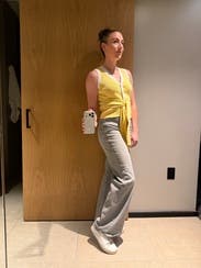 I love a bright yellow piece. The tie wrap in the front is flattering for the waist and covers the belly. It's a thicker sweater material so not great for super hot summers but nice for inside and appropriate for the office, date, etc.