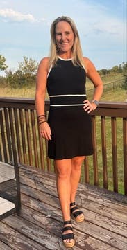 I liked this dress, but it was tighter than I expected and required a racerback bra. Even so my boobs still looked a bit saggy? It also sat lower in the back than the front. It’s a knit material but shows skin so it was okay for summer.