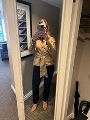 Nice material and structure. Fit is true to size. Love the gold buttons and belt features. Would recommend!