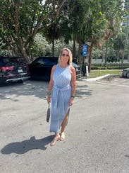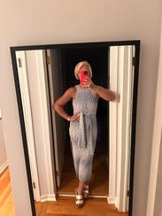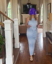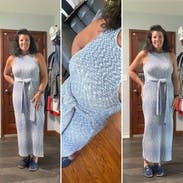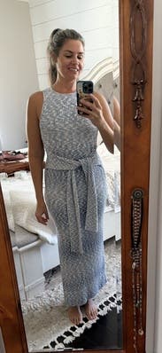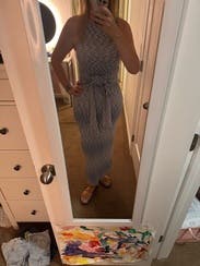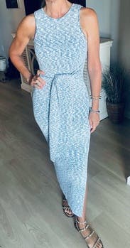 This was cute and causal enough to throw on with slides. Sorry the only pic I took was on a construction tour! It’s sweater material but was fine to wear in summer - even in Louisiana. I liked the mild striping look in the material and the wrap waist was flattering.