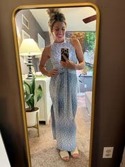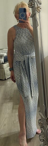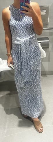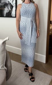 I originally rented this dress for work, but the side slit was a bit too high for the office. Instead, I wore it for a weekend lunch with family and dinner with friends. The ombré blue color elevated the look, and the oversized ties were great for providing tummy coverage. It's both comfortable and stylish. I would definitely recommend it!