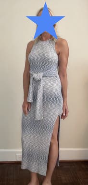 This is my first rental that came new with tags!!. The quality and material are really amazing on this one. I wore it to work for a lunch meeting and did not think the slit was too high. it is a thick sweater material but it wasn’t too hot for me. Waist tie is flattering. Keeping it around for another day!