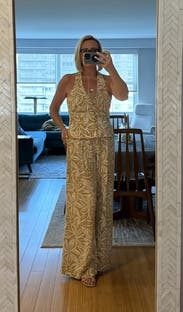 Great print and quality fabric, but it ended up looking a bit more corporate than I wanted for vacation. Gold button details and halter neck I liked, but it wasn't as flattering as I hoped. Make sure to size up like 2x for the pants if you're getting the set as they ran super small.