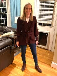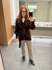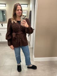 This is the cutest sweater! I wore it so many times and am keeping it in my next swap. The brown is so pretty, waist tie is very flattering, just the perfect winter piece!