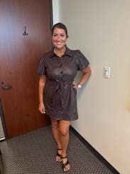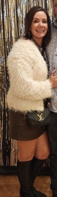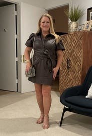 This fun little dress was very true to size. I have found with many faux leather items that I need to size up. I'm glad I did because it was a perfect fit, actually had a bit of stretch to it. I loved that I could try different looks with the belt. Bonus, it has pockets! The purse is also a RTR which complemented the dress. I added a big chunky gold necklace to complete the look. I received so many compliments which made wearing the dress even more enjoyable. I will certainly be looking to add this darling dress to my shopping bag again.