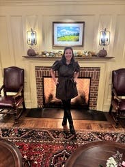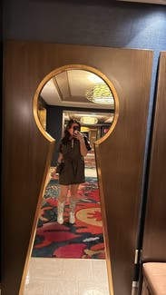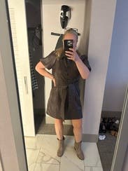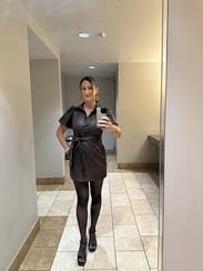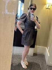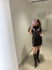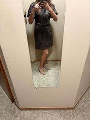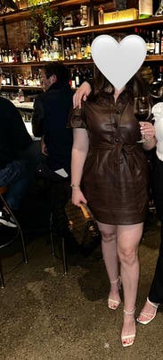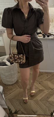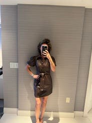 Fun leather looking dress! Be warned it is short (5’8” tall), so tights were a good fix! Sometimes, with A line skirts I can wear a 4, but not in this dress since it was short and the buttons on the top were close to not fitting. It has a tie waist to cinch everything in, which was great! The puff sleeves were nice and I was worried the fabric would make me hot, but it didn’t. Would rent agin.