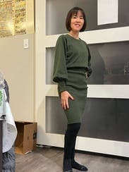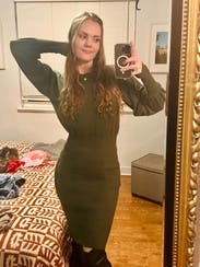 The dress color is the perfect fall green. The dress itself was so soft and comfortable I could lounge in it or dress it up a bit for a day outing. The loose top and arms matches with the loose then tight sleeves is perfect. Also for long sleeves these are actually long.