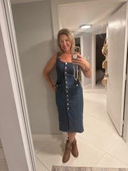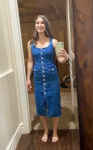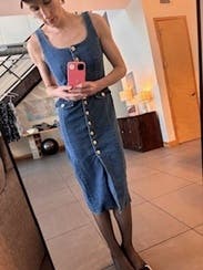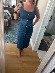 Great denim dress. I considered buying and having the seams sewn down. The opening on the legs kept getting caught on my knees - not cute. Otherwise dress is well made. Bust is a bit tight but the stretch had enough give for me. I wore Cakes (jewels covers) and was gtg. Dress is TTS.