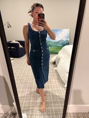 This dress is lovely, versatile, and timeless. It’s a stiffer denim but works with the style. It’s runs a touch large but the size 2 worked well with the fabric, allowing for a bit more movement which works with the type of denim and style. If it was skintight the front buttons would probably pucker too much when I moved around.