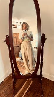 Great piece I wore a few different ways. Easy to dress up or down; I paired with navy baggy trousers (in photo) and with a high waisted white skirt. Loved the versatility and look. It’s medium thick in material so it held its shape nicely and definitely cropped (in the photo posted, the pants sat a bit lower than I usually wear). If you like cropped or have a short torso like myself, I recommend this 10/10