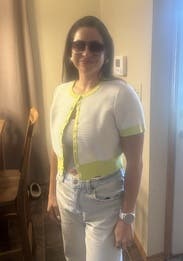 Simple design but the unique color combination and material made this cropped cardigan interesting, fun, and sophisticated all at the same time. Fit perfectly on my petite frame.