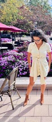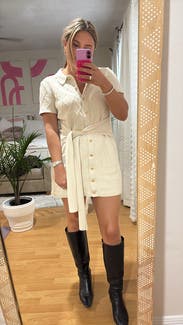 Like this dress way better than I thought it would! The gold buttons are such a classy detail and really elevate the piece. Always a wap, as it itches you in and makes you look snatched! Paired with cream, woven heels with tiny pearls on them and a tan chanel. I’m 5’3 & it was the perfect length, but I imagine it would be too short for someone taller!