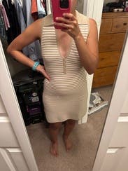 I loved this dress because it was stretchy and fit right over my bump! Made me still feel stylish and cute for lunch with the girls. I did size up 2 sizes from my normal size since I’m 35 weeks pregnant