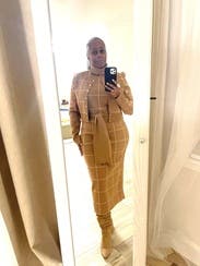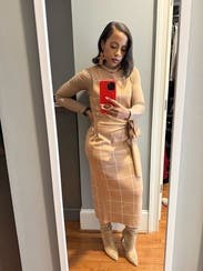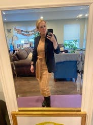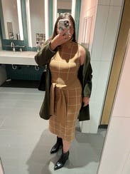 Lovely knit dress hugged all the curves and was flattering. Wore with the long sister weather, tights and boots at work.