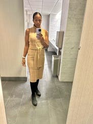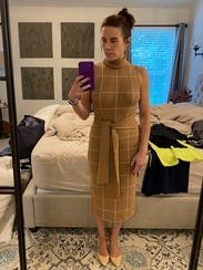 Loved the belt, wasn't sure it would work for me but the fabric is thick/heavy enough that it looked good all day. The split in the back was a little high for me so I wore tights. The neck was comfy whereas sometimes turtlenecks bother me.