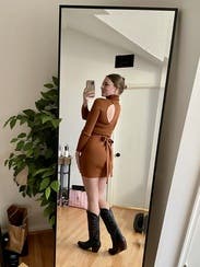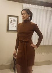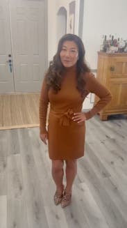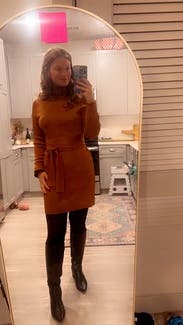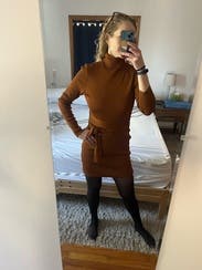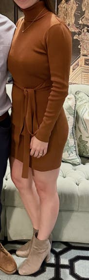 I absolutely loved the dress. The material is thick and warm and it doesn’t shift around so you can confidently wear it without having to tug at it. I was able to wear T style back easily and also shape we are underneath which was nice to reduce the bumps around the midsection. Loved the turtleneck and how warm it kept even though it’s pretty short. My only issue is is that the Thai seemed a little bit too long and I didn’t want to tie it around the front and then the back but maybe I will try that next time I rent. I will definitely be renting again.