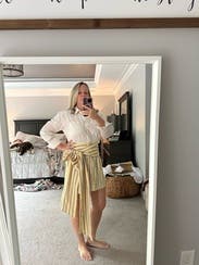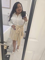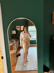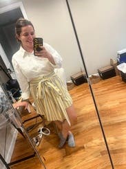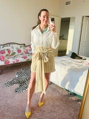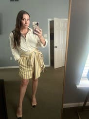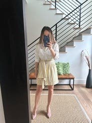 I love the style of this dress. It looks like a shirt and skirt with bow, but the convenience of being a dress. Love the buttery color. IG @bethielife