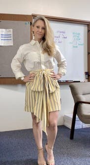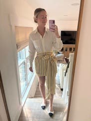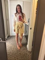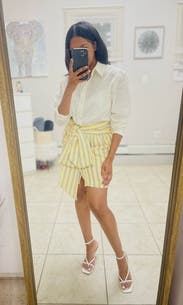 This dress is perfection. It’s clean, crisp and super cute. The top half is serious while bottom half screams sexy fun. I love the combination of fabrics. The subtle stripes in the yellow skirt - Chefs kiss. If this wasn’t so expensive I would’ve already bought it. This is a top rental for me, can’t wait to get this again.