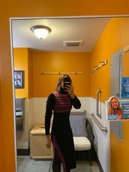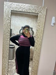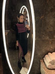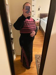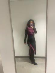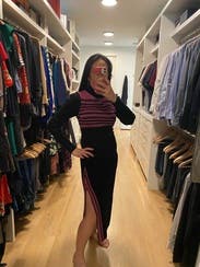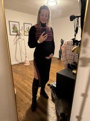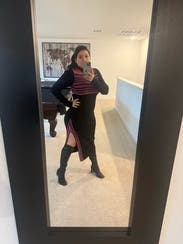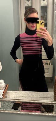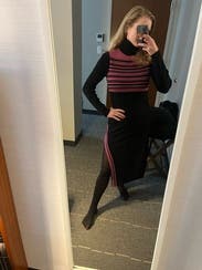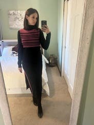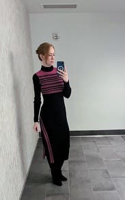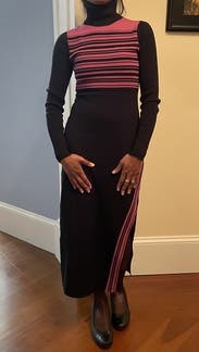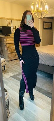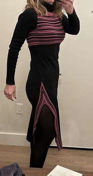 Really liked this dress — wish I could’ve given it a 4.5 rating. I’d consider buying it. Warm! Love the fabric and it wasn’t too tight. I love the stripe down the slit but note that the slit is a little high. I wore tights and high boots.