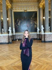 Got lots of compliments on this piece! The pink accents are very flattering. The slit was nice too. Not too high. Very warm and not itchy. I’d rent this again.