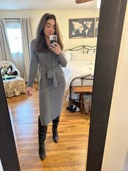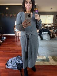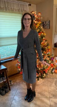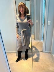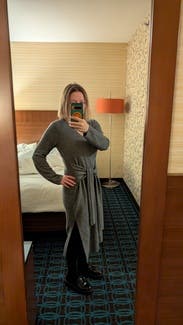 Love traveling with a good sweater dress. No wrinkles and absolute comfort. This one runs a bit thinner than others so would work during the transition months. The tie adds a touch of much-needed interest.