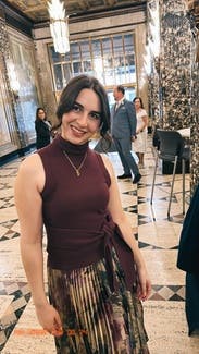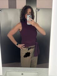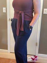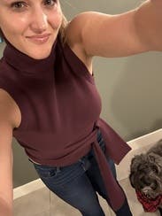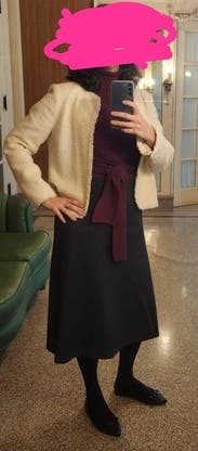 I wore this to a grad school interview and the style of the top made me feel confident! I sized up because sometimes the tight fit of a knit makes me uncomfy. The color was perfect and you can dress this top up or down!