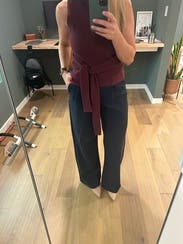 I wore this with black pants to dress up for a special dinner and wide leg jeans to dress down for an every day outfit. A great piece that I would rent again.
