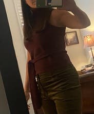 I love the tie, the material is thick and nice quality. But it tends to ride up a bit and the arm holes will show your bra if you’re larger chested. Was perfect paired with a sweater.