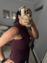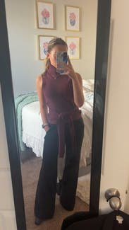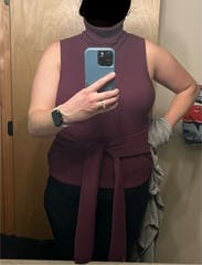 Maybe this is because I’m busty, but the arm holes would NOT lay flat no matter how I pulled it. I love the look of it otherwise. The color is beautiful. I live in a warm climate but love fall fashion. I thought the fact this is sleeveless would make up for the fact it’s a turtleneck. I guess it kind of did, but the neck still bothered me. Too much material there. I feel like this would have been perfect if it was a mock neck or just a regular turtleneck that you didn’t need to fold over. But the extra fabric made my neck hot even if the rest of me wasn’t. I think it would be a good layering piece for people in colder climates, but then again I’m not sure how the belt would work with a jacket or coat over it. Also, I think the length was ok on me, maybe would have been better if it was a little longer. I don’t know how tall busty girls could wear this without it being a crop top.