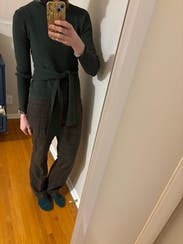 Loved this sweater. High quality, not itchy. Fit was great and the tie at the waist was a nice touch. Also paired with black pants and wore to work.