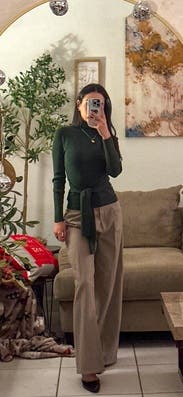 A chic forest green turtleneck sweater by TOCCIN X RTR features a ribbed texture and a unique tie-waist detail for a sophisticated touch. Pair it with tailored trousers and statement earrings for a polished ensemble.