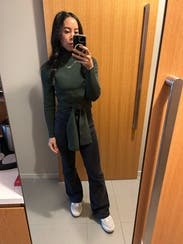 Great fit. Works for casual or work day. Great color and fit. Thin but warm. The tie gives it some interest! The back of the turtleneck does flip up on the bottom (if that annoys you), so some people may need to adjust it throughout the day.