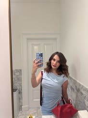 get it!! I got so many compliments and the color is beautiful. I usually avoid pastels, but the light blue with the burgundy straps is so pretty together. Length is on the shorter side but not awkward for 5'5. If you're between sizes, I'd size up. The fabric gives a little but not super stretchy. The fabric has more texture than it seems in the e-commerce photos, but it's still stunning. The top and the bottom are attached, but you can adjust the straps to decide how much skin you want to show or not. Can not recommend it enough!