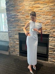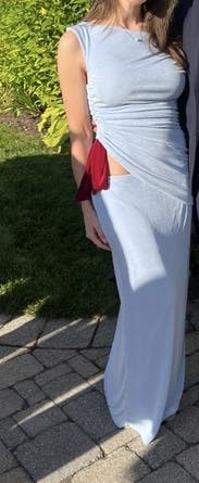 This dress was stunning! Could have gotten away with a M, as it was a bit bigger, and the slit did not show at all. I loved it that way as well.